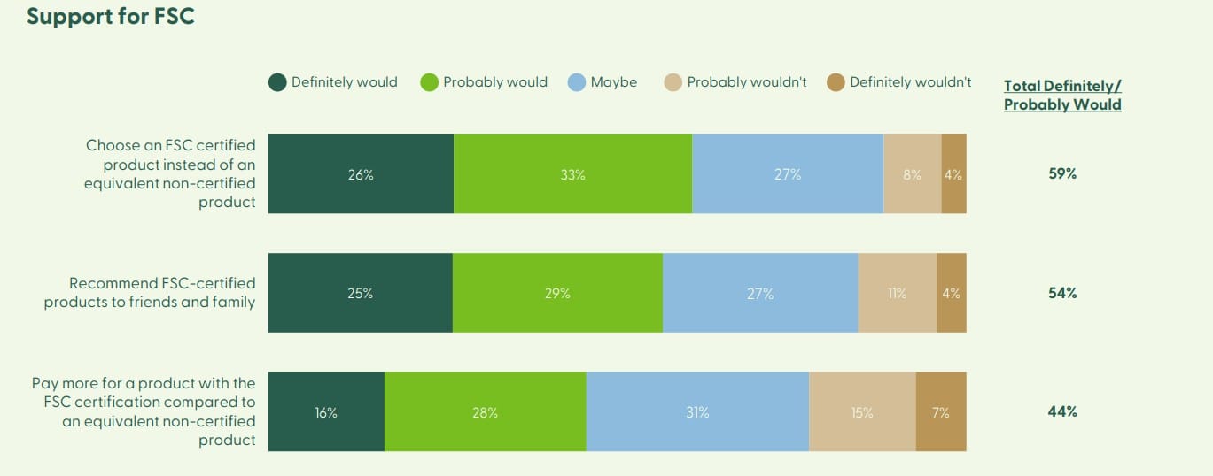 Op de vraag of mensen ook daadwerkelijk meer willen betalen voor een product met FSC-certificering in vergelijking met een gelijkwaardig niet-gecertificeerd product zegt 16 procent van alle ondervraagden dat zeker wel te willen. 28 procent waarschijnlijk wel, 31 procent misschien, en 22 procent wil dit waarschijnlijk niet of zekers niet. (15 procent wil waarschijnlijk niet meer betalen, 7 procent is daar al zeker van en wil geen meerprijs betalen).