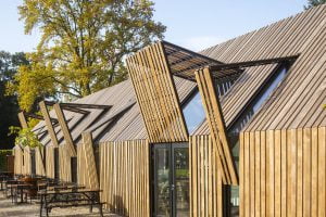 De beweegbare luiken van het bezoekerspaviljoen gaan ’s morgens open en ’s avonds dicht. De geveldelen zijn van NobelWood; de spanten van inlands lariks.